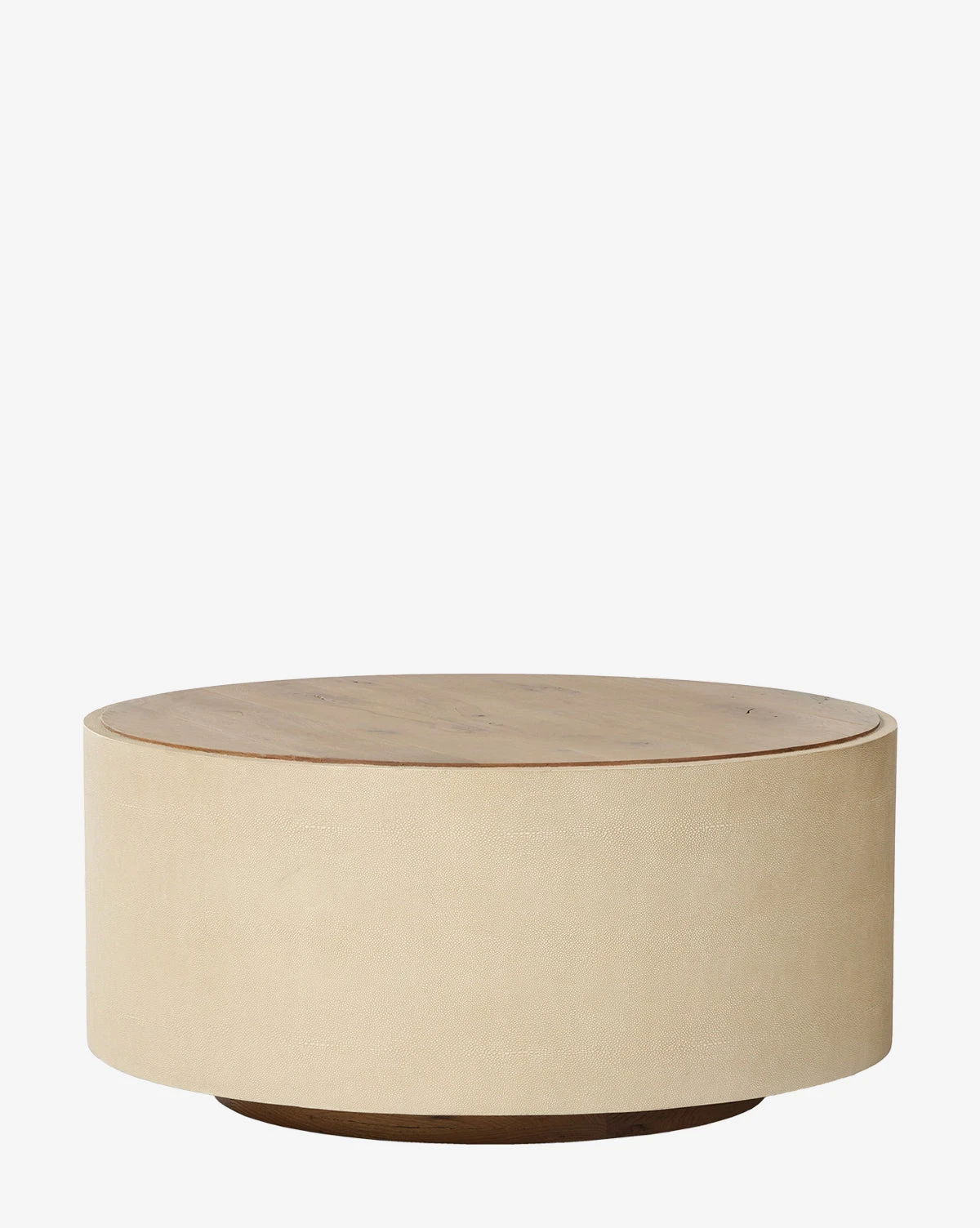 A beautiful oak tabletop with natural detail makes the Adderley Coffee Table stand out. With a round form covered in light cream shagreen, the coffee table makes a unique base for decor and entertaining.