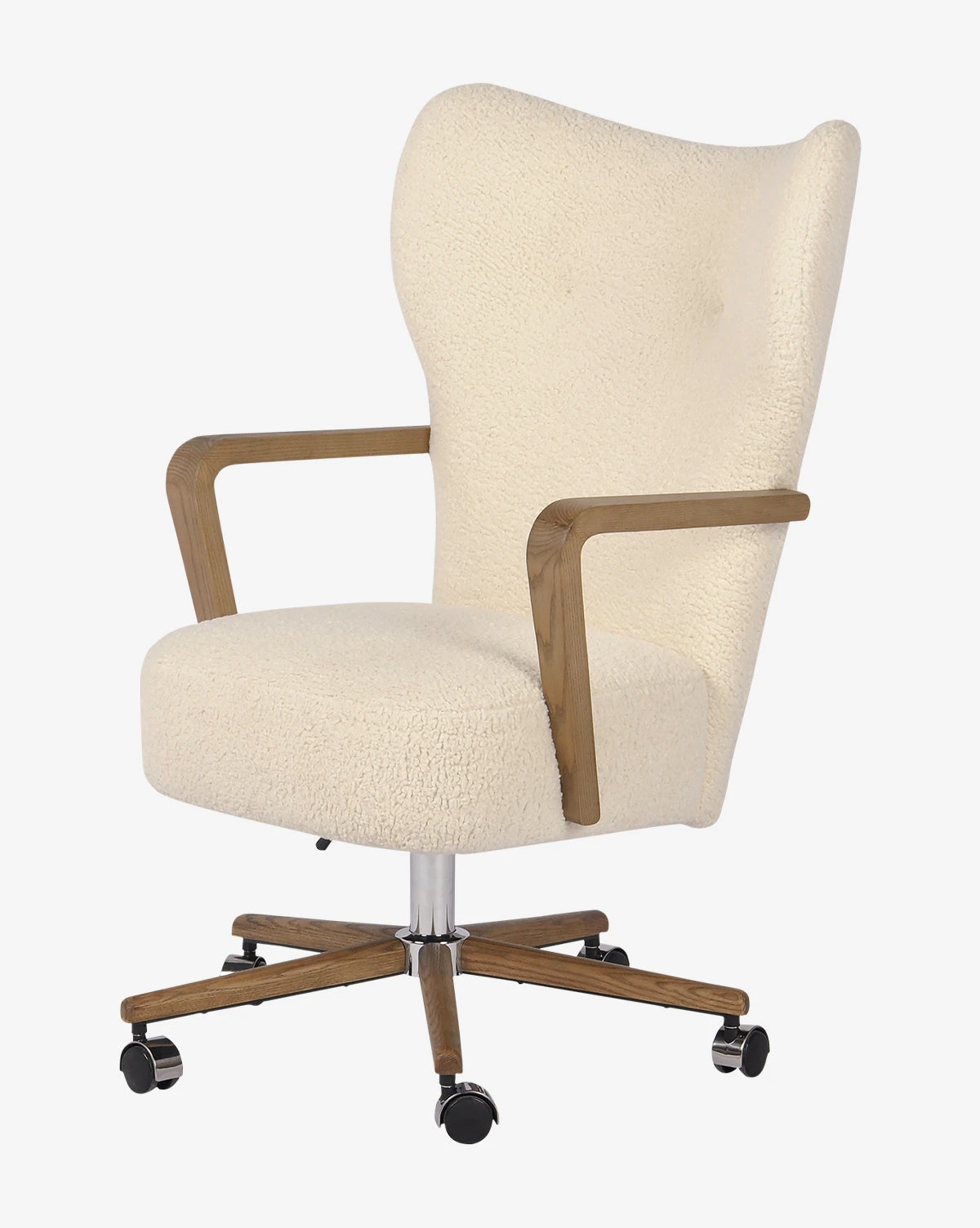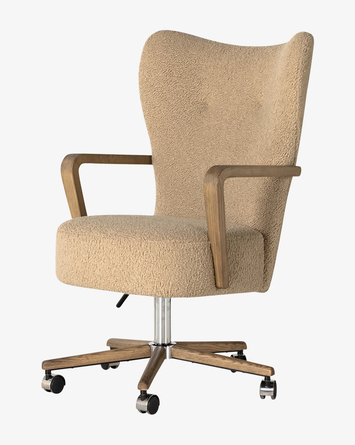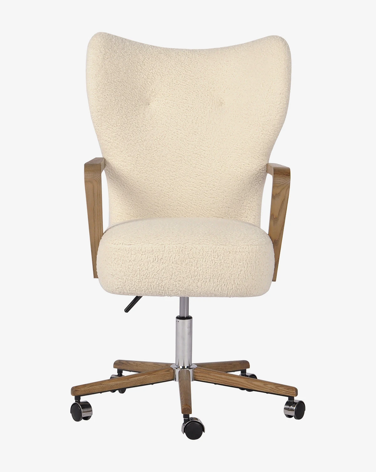 Comfortable and textural, the Crowley Desk Chair is an updated version of the home office classic. Its transitional style highlights a modern mix of materials while maintaining a classic form. With solid ash arms surrounding the faux sheepskin upholstered seat, the desk chair is inviting and easy to style.