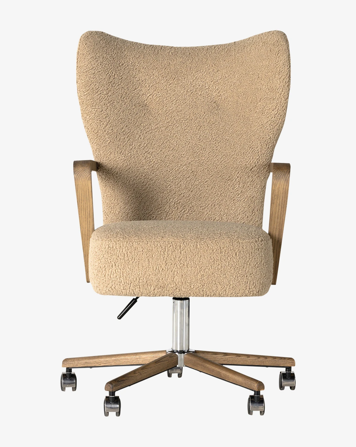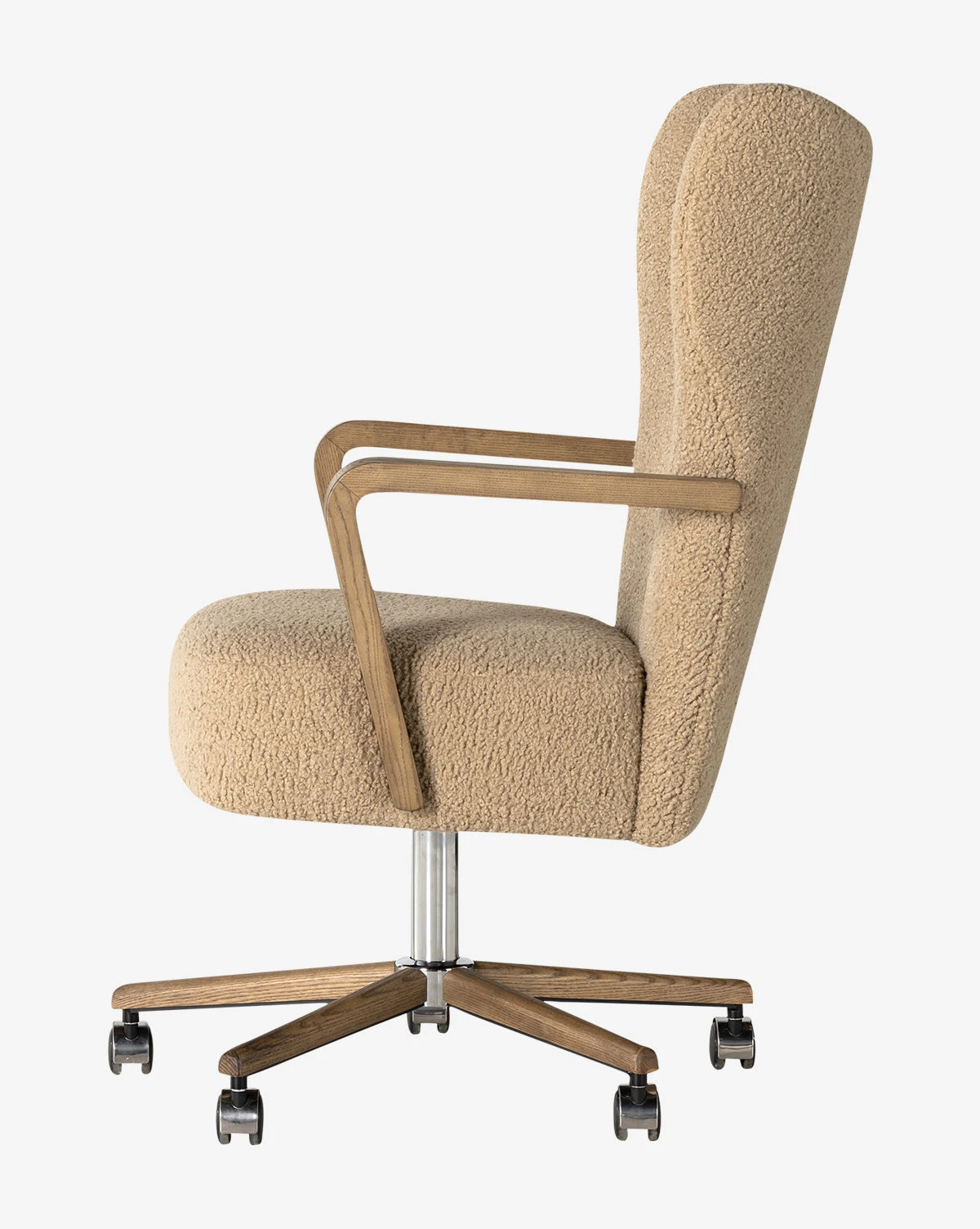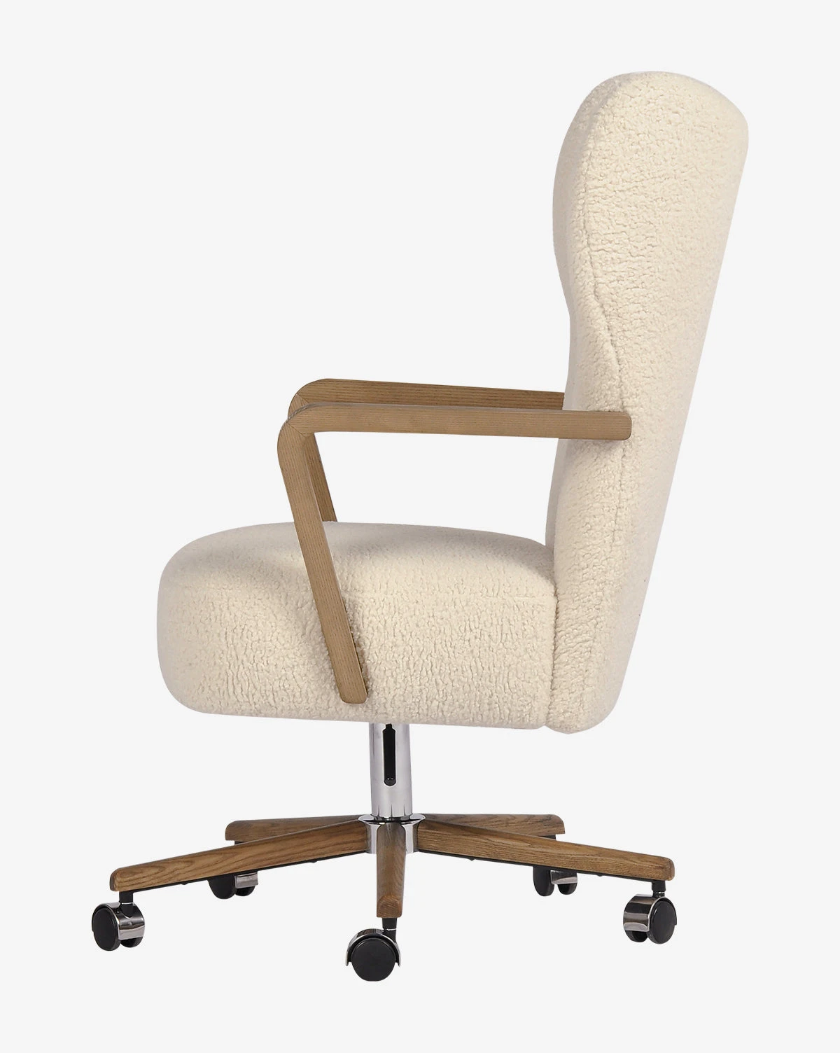 Comfortable and textural, the Crowley Desk Chair is an updated version of the home office classic. Its transitional style highlights a modern mix of materials while maintaining a classic form. With solid ash arms surrounding the faux sheepskin upholstered seat, the desk chair is inviting and easy to style.