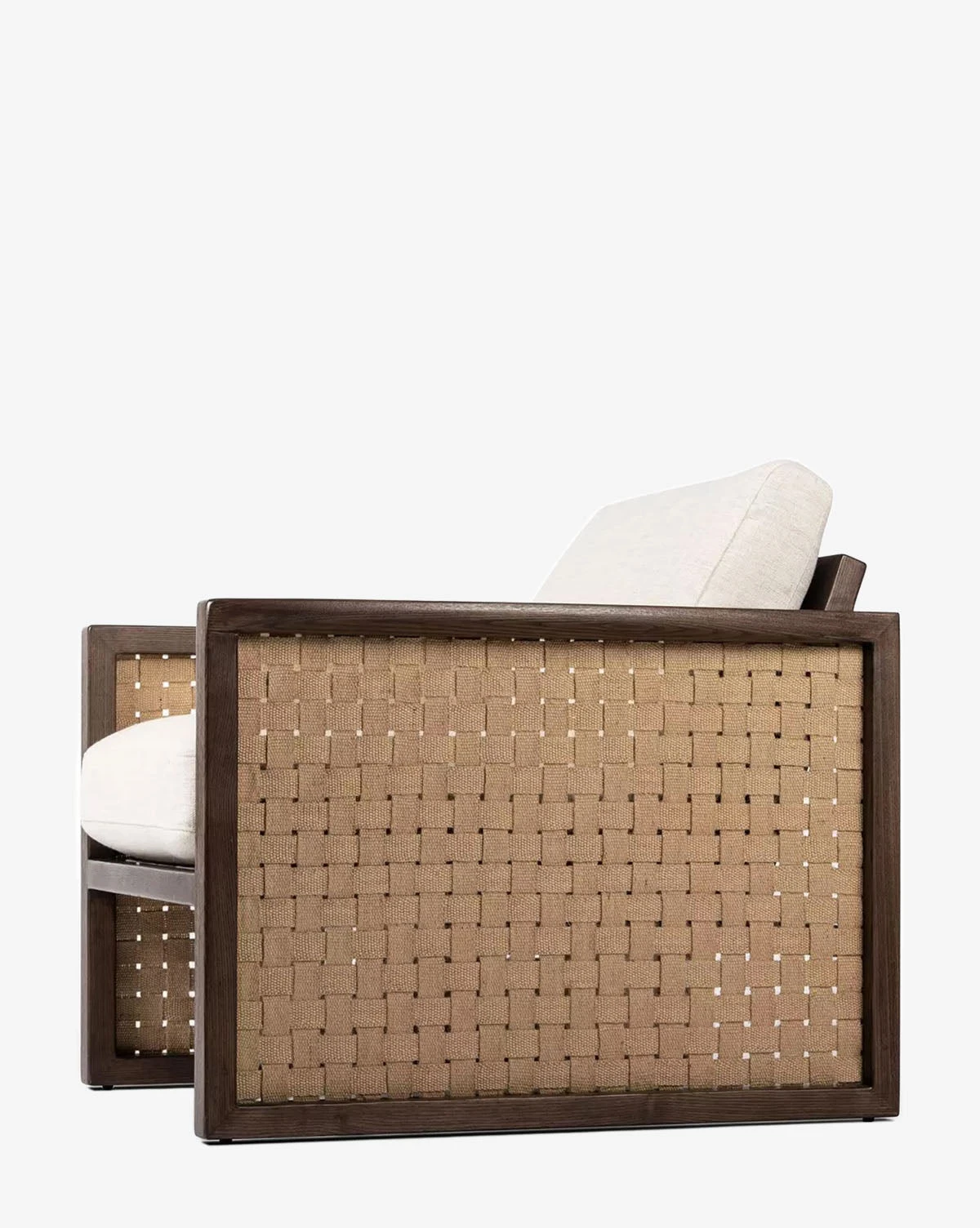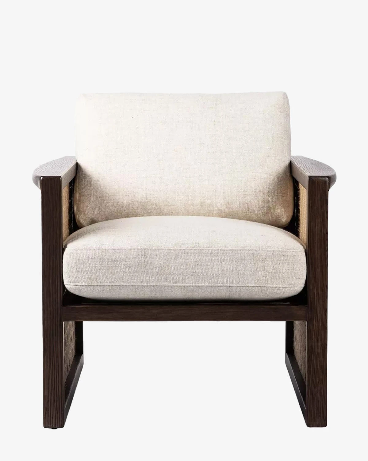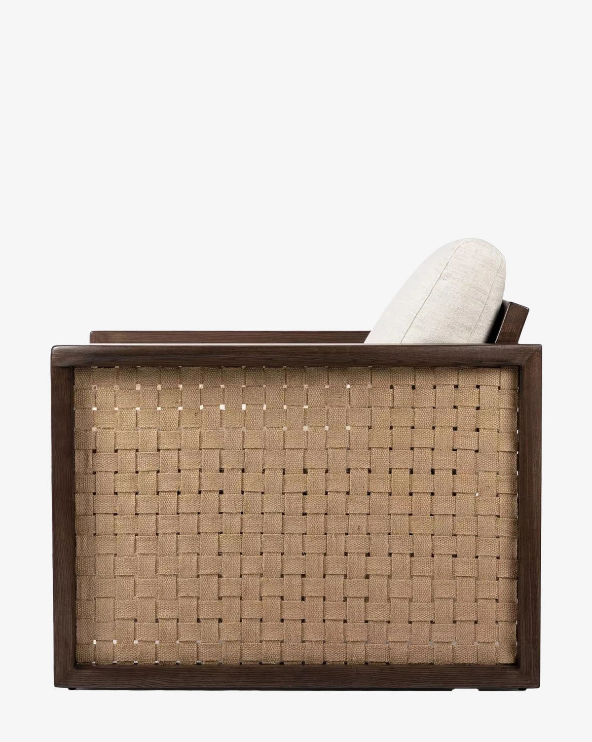 Comfortable and timeless, the Elspeth Lounge Chair is crafted with ash wood in a rich brown finish, featuring woven jute side panels. Its intricately detailed frame holds plush upholstered cushions in a cream tone.