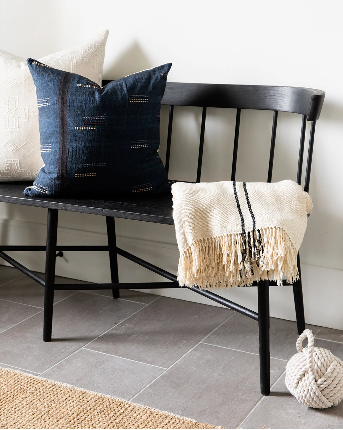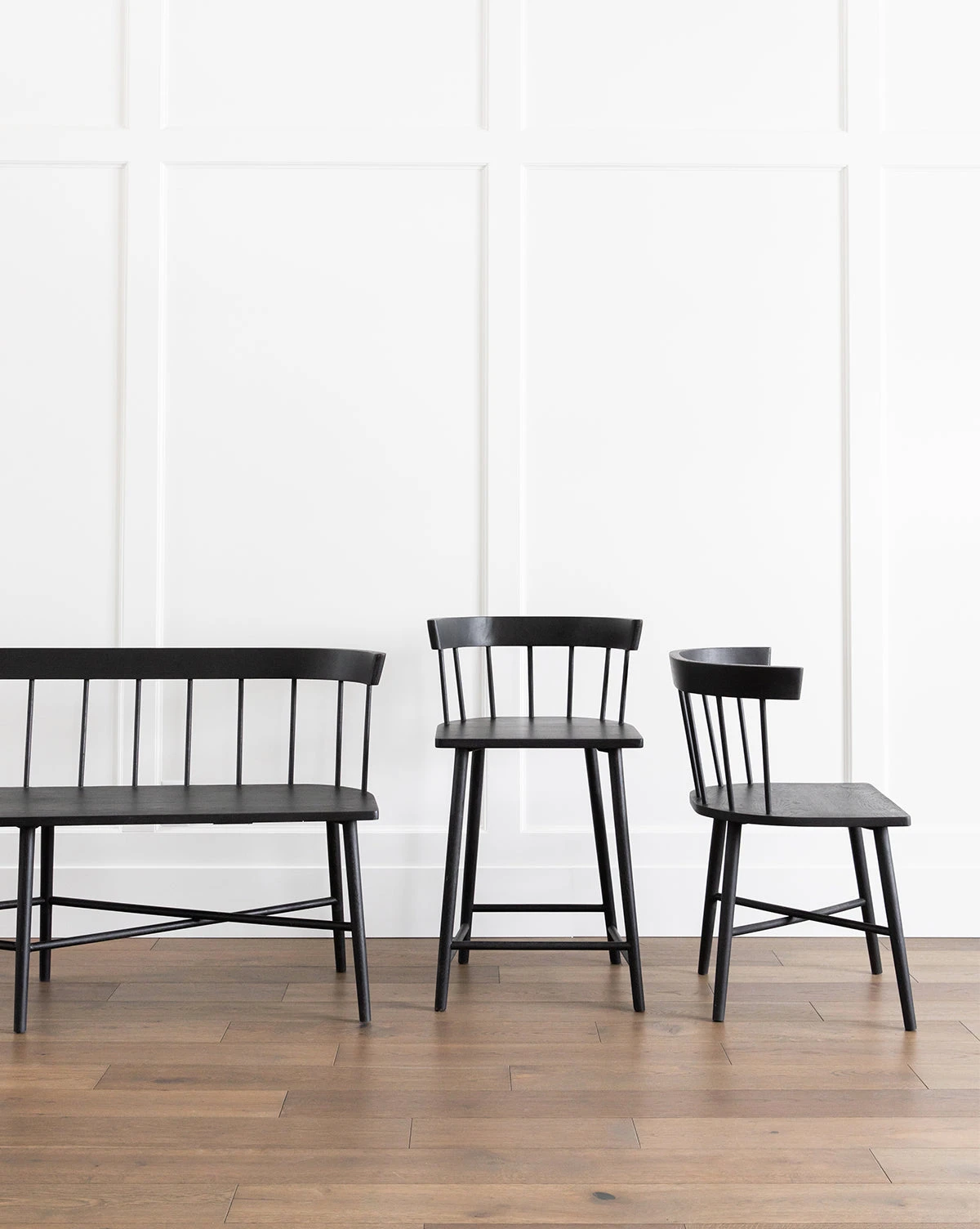 When we designed the Reeves Bench, we wanted to mesh contemporary and traditional styles seamlessly, and we did just that. From the spindles to the architectural base finished off with tapered legs, this bench redefines classic design through its thoughtful attention to detail. Crafted from solid, kiln-dried oak with a black finish, this bench adds dimension to your mudroom or entryway with ease.