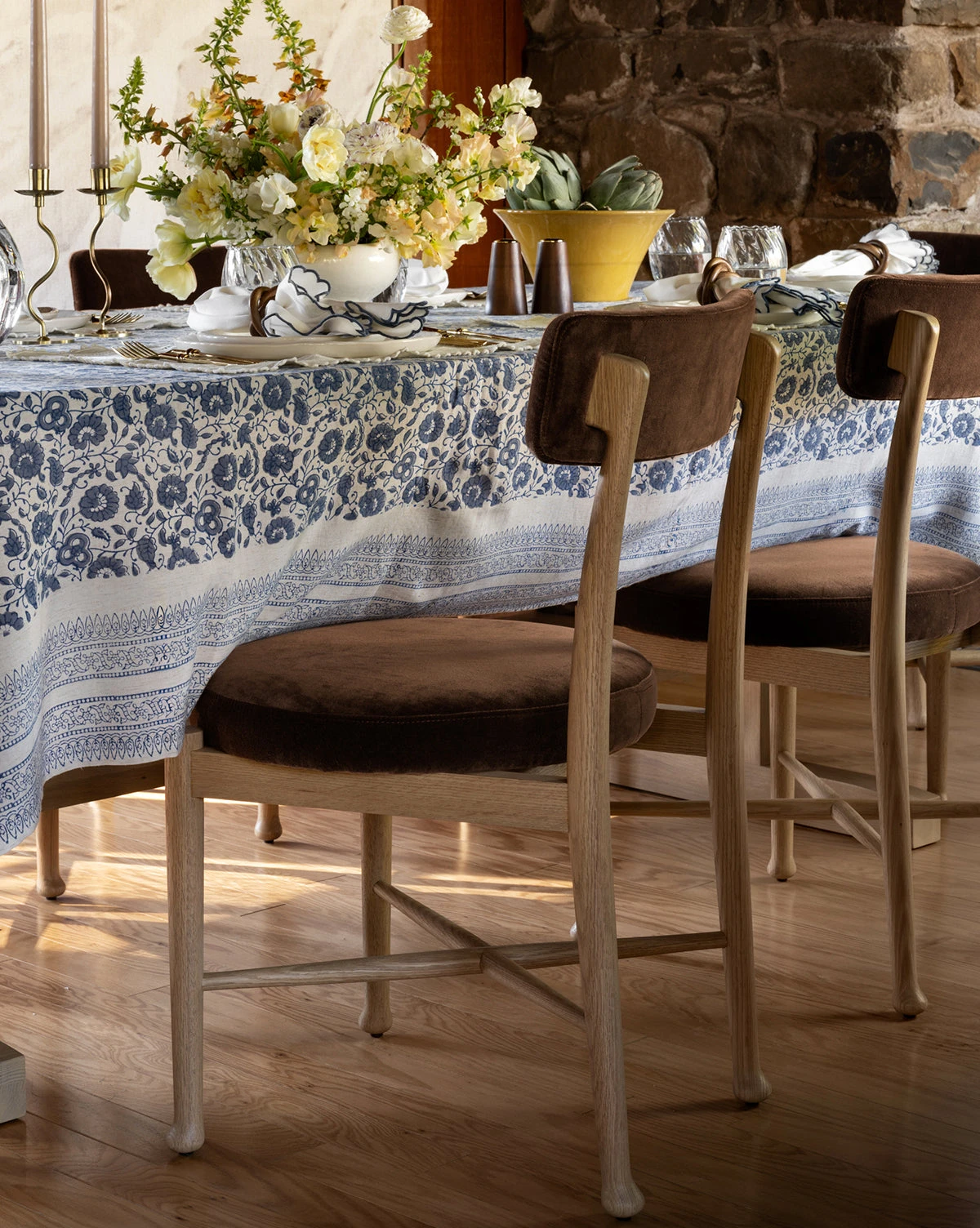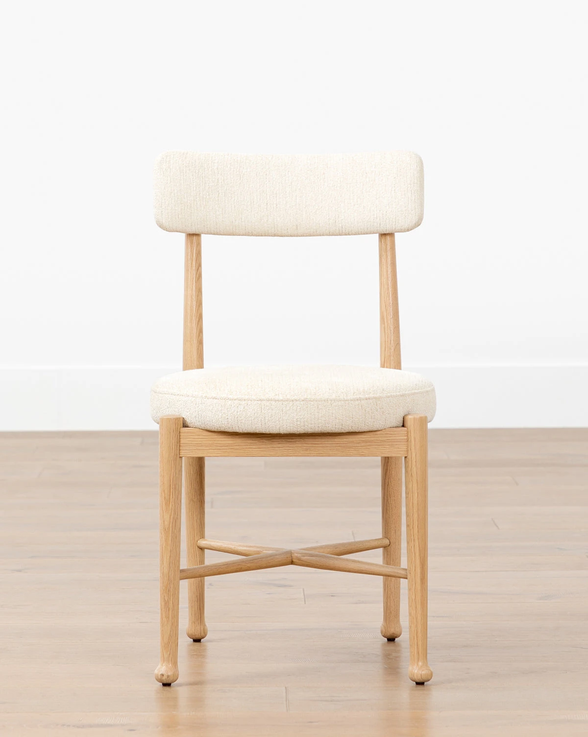 Artfully designed with a solid white oak frame, the Garance Dining Chair has a pitch in its backrest for comfortable seating. In either a parchment crypton or a pecan performance velvet, the upholstered dining chair has a timeless appeal with its curved ball foot and round seat.