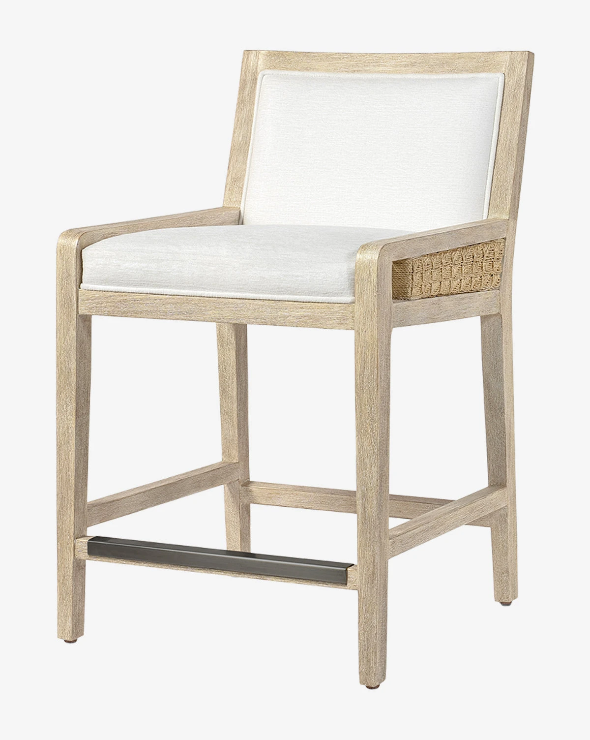 The material mix of the Kadoka Stool not only elevates its design but adds casual approachability. The light whitewash finish on the frame holds abaca rope side panels and white upholstered seat and back cushions for a welcoming kitchen seat. Â