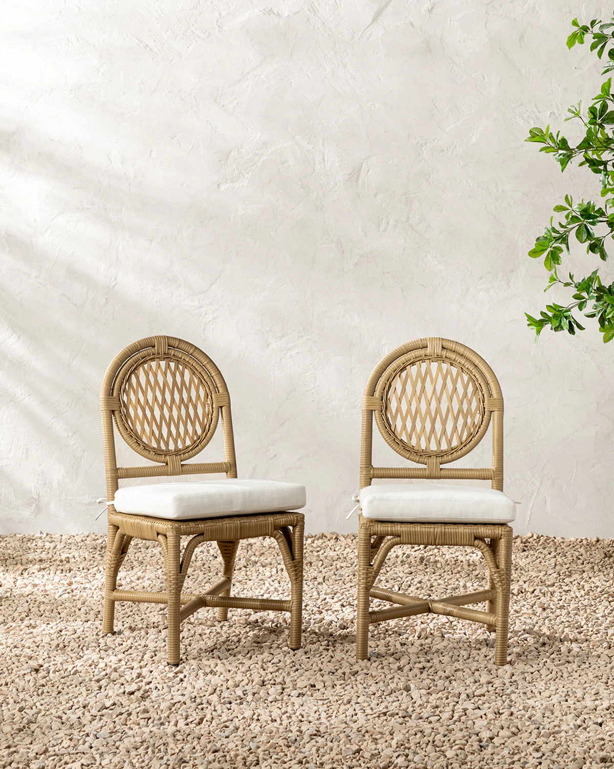 Crafted with a handwoven all-weather wicker frame, the Marisol Outdoor Dining Chair offers a classic aesthetic and weather resistance to outdoor dining. Complete with a loose seat cushion upholstered in white performance fabric, we designed these outdoor dining chairs to bring enduring comfort and beauty to your outdoor spaces.
