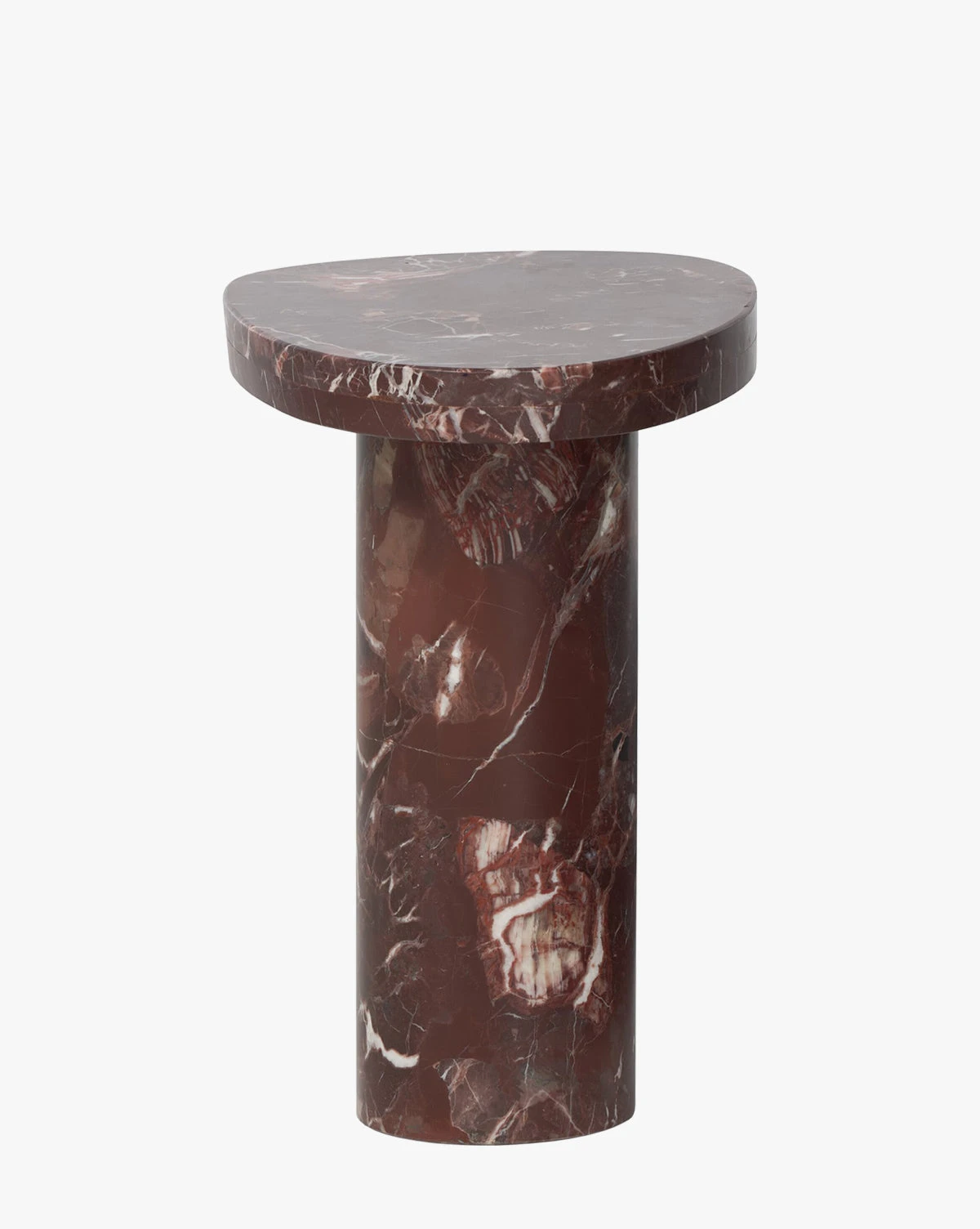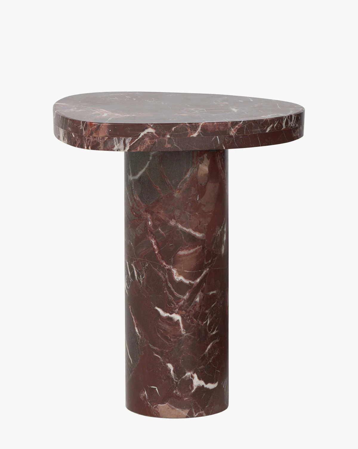 Shape and material share the spotlight in the Merlot Marble End Table. Crafted from solid marble in a rich merlot hue with natural veining, its sculptural pedestal silhouette feels both bold and timeless — a striking accent that brings refined depth to any space.