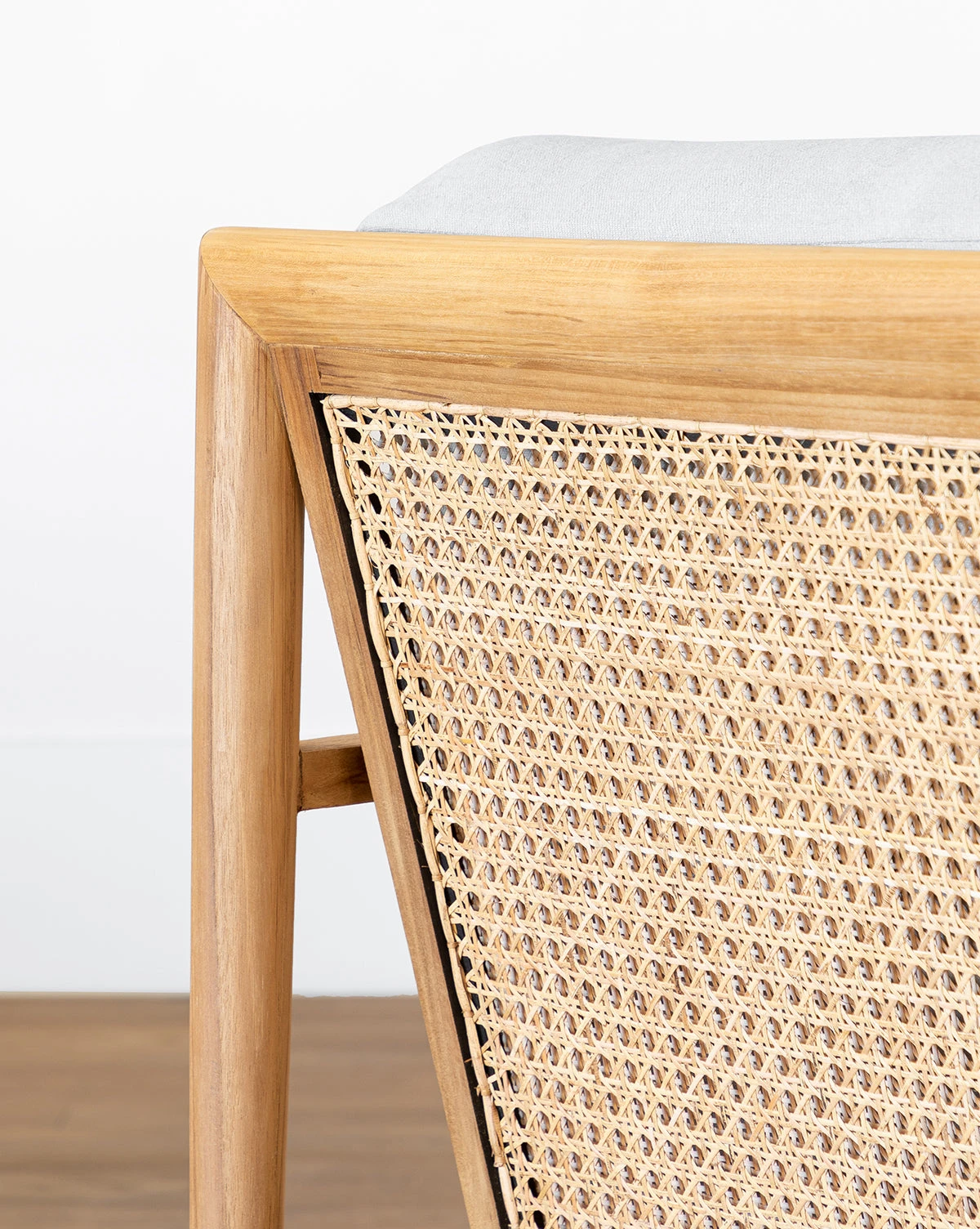 Comfortable and classic, our Beckett Chair is crafted from high-grade teak, for unprecedented durability. Its simple, natural finished frame draws the eye with its intricately caned back detail, while light linen blend cushions provide luxurious comfort. Styled in pairs in your living room, or simply placed in your reading nook, this chair lends a sophisticated, relaxed feel wherever it’s placed.Â