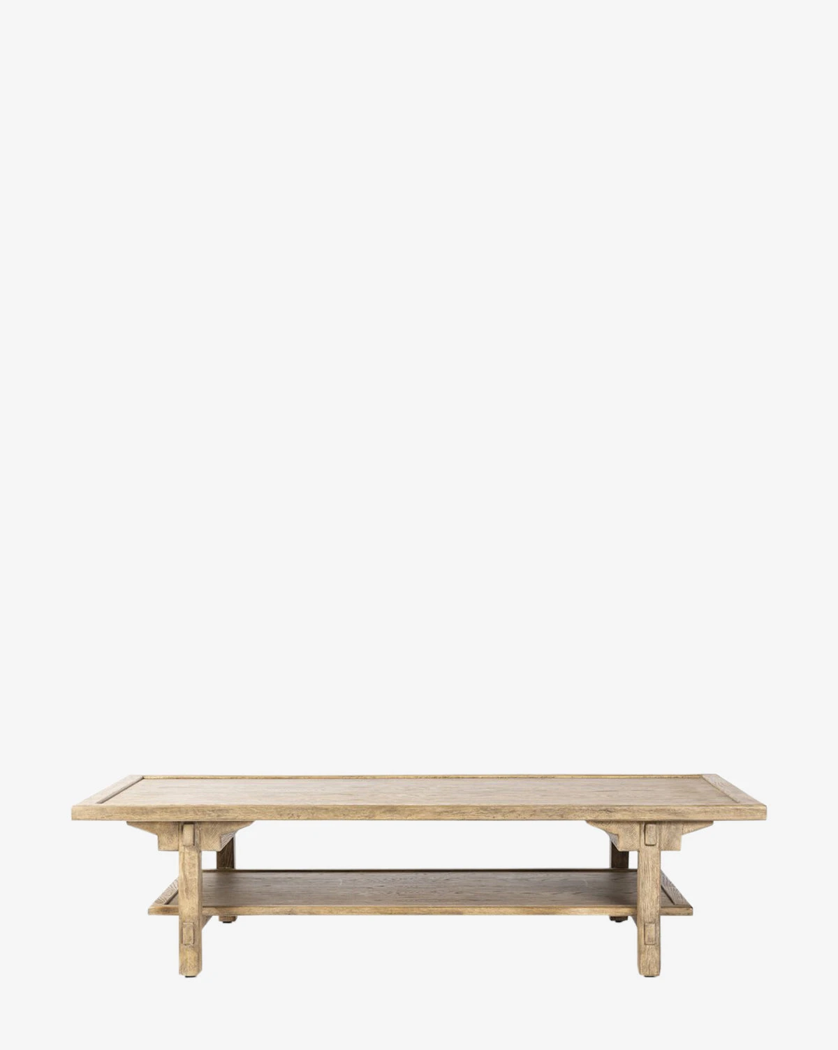 In a rustic-meets-modern design, the Orion Coffee Table is crafted from white oak with a distressed light finish. Its farmhouse-style structure and natural details make it the perfect base for styling. Â
