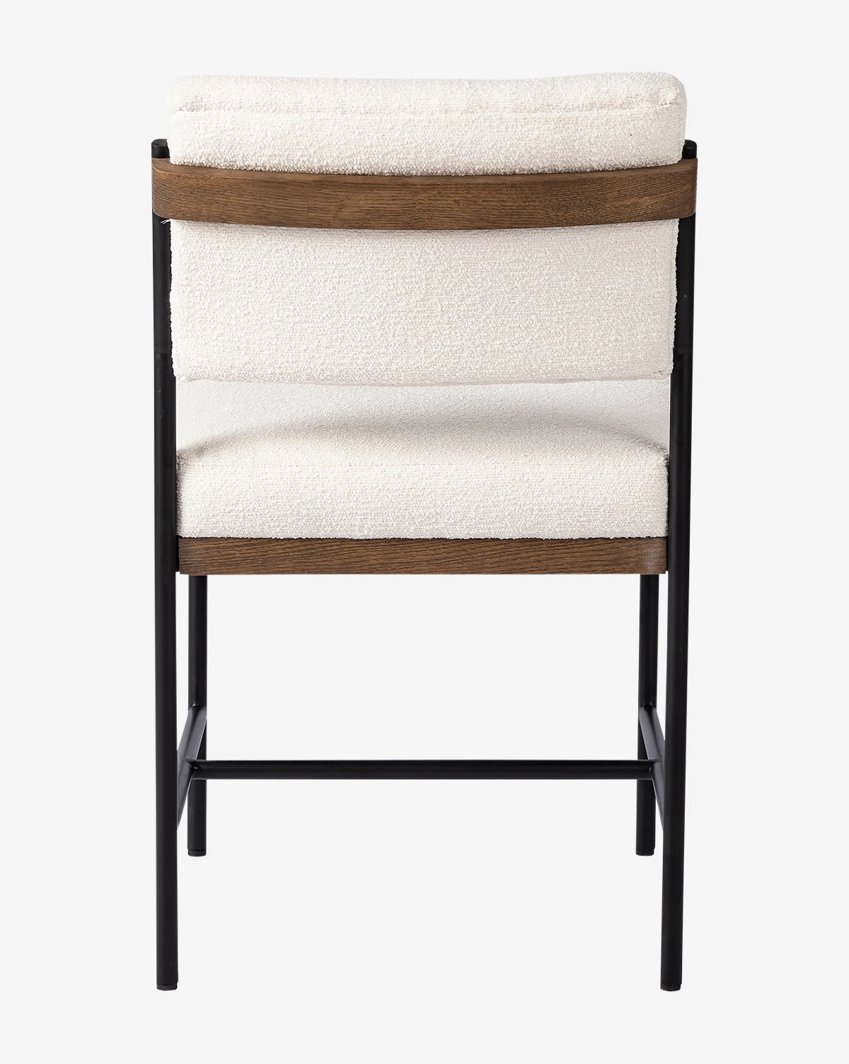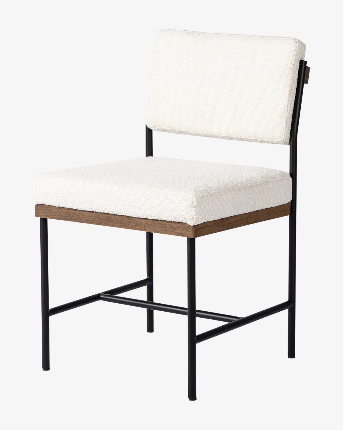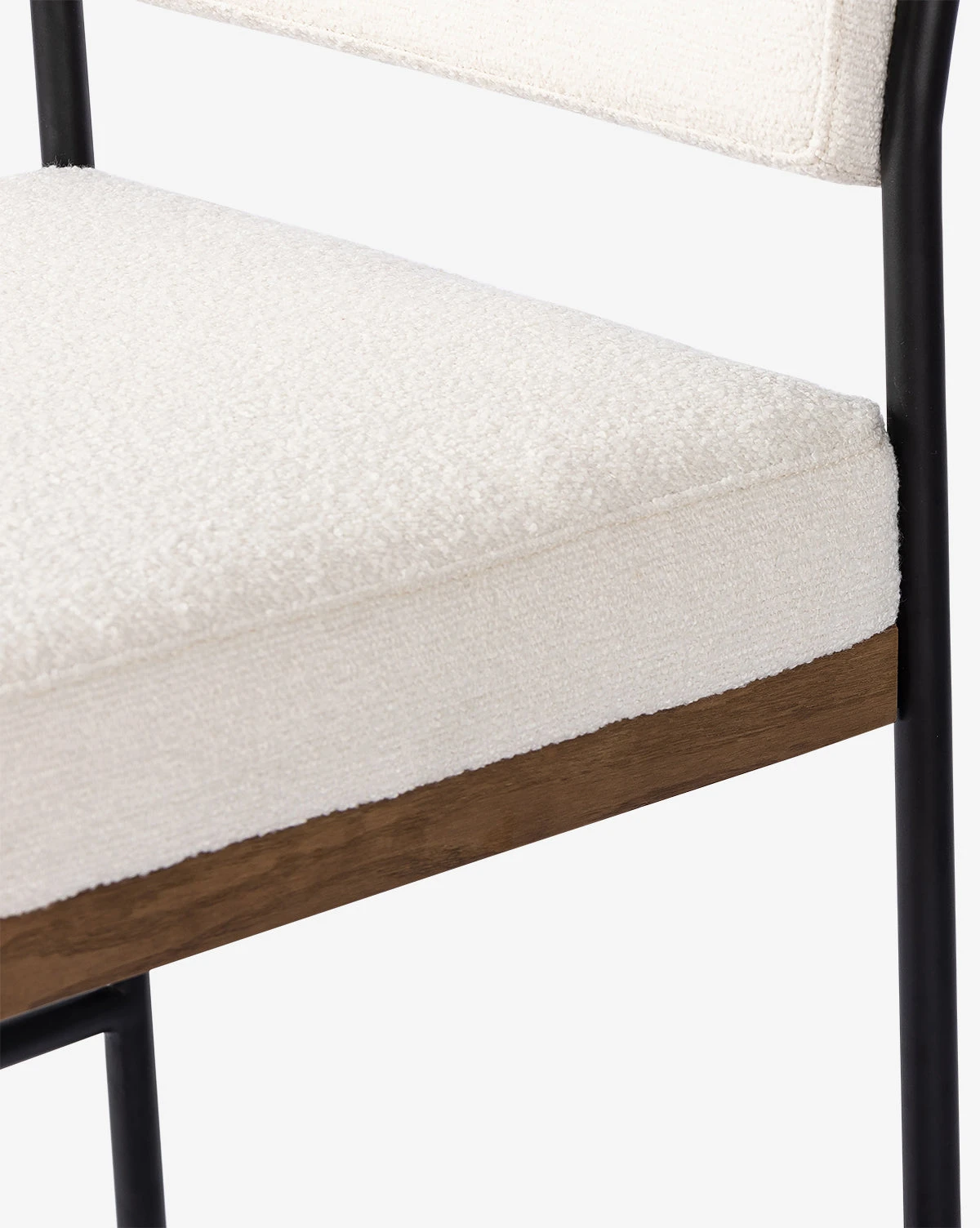 With a timeless mix of materials, the Pascal Chair creates a subtly elevated and inviting feel around your dining table. Its steel and wood structure holds a seat and back cushion in either a cloud or chestnut fabric.
