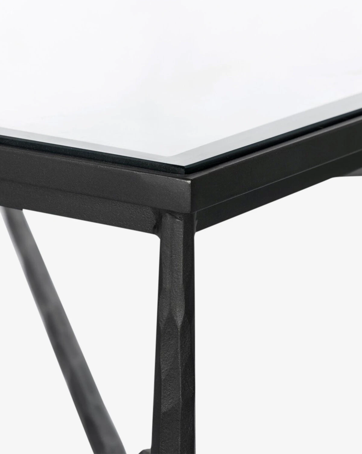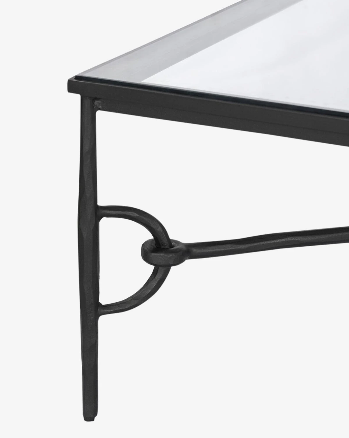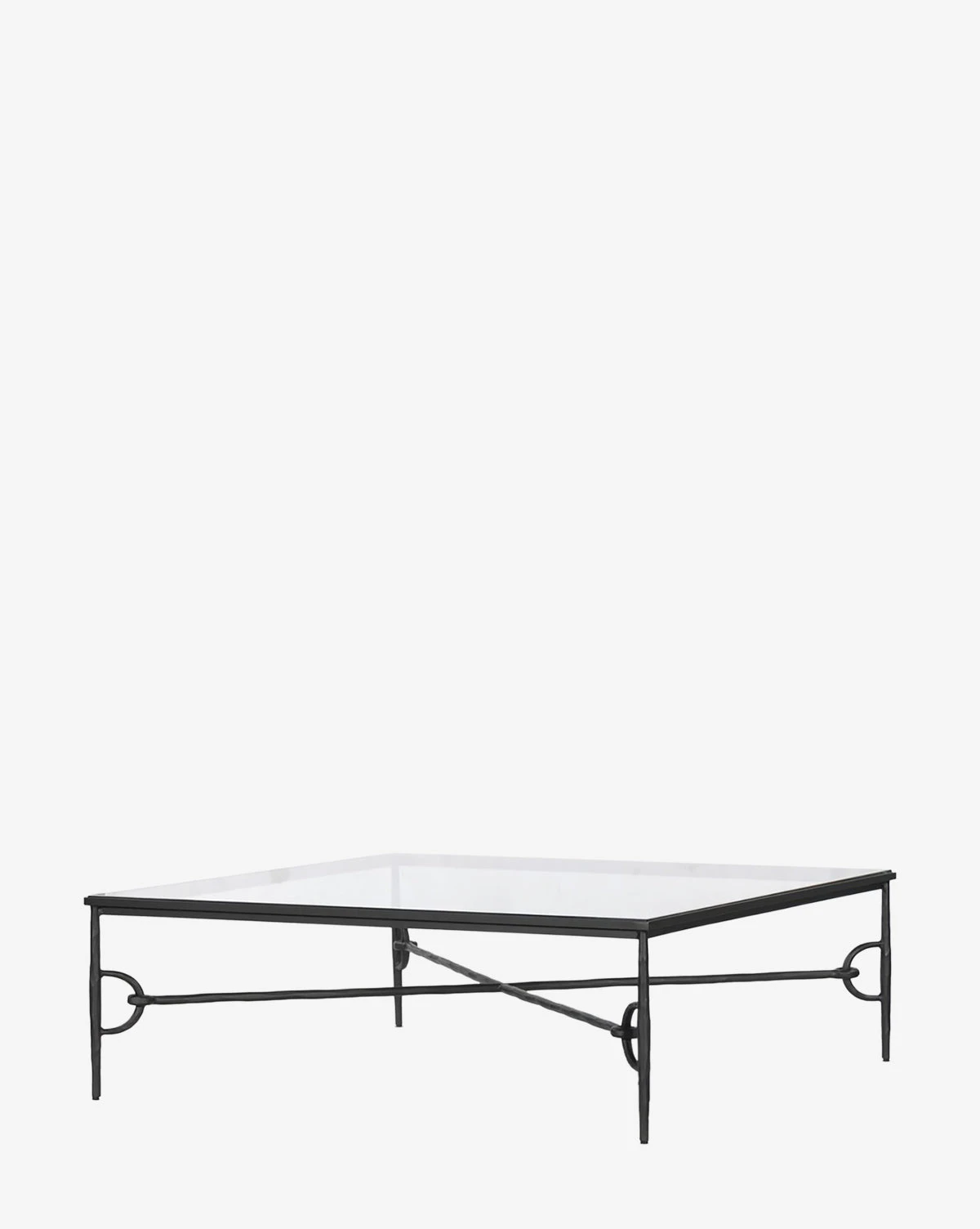 Sleek, timeless, and durable, the Skye Coffee Table pairs a slim hammered gunmetal frame with a tempered glass top. Stretchers and metal loops elevate the table’s simple design with a touch of sophisticated detailing. Â
