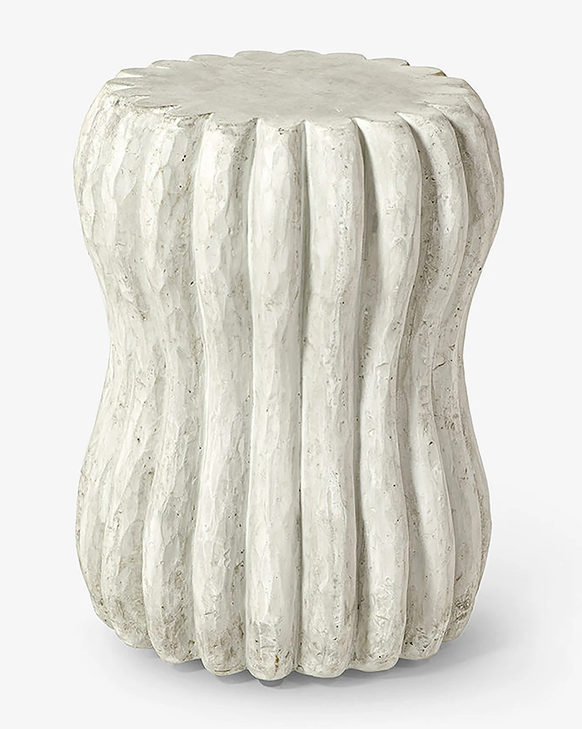 Dramatically ribbed in a classic curve silhouette shape, the Tycen Indoor / Outdoor Side Table is hand-chiseled with detail. Crafted from composite stone and given an aged white cement finish, its porous texture is coated to protect against small spills for a low-maintenance addition to outdoor styling. Due to the handmade nature of this product, no two will be exactly alike.